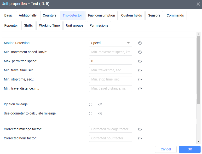 Данная вкладка предоставляет настройки для определения движения объекта, анализа поездок, расчёта пробега и моточасов, а также фильтрации данных.