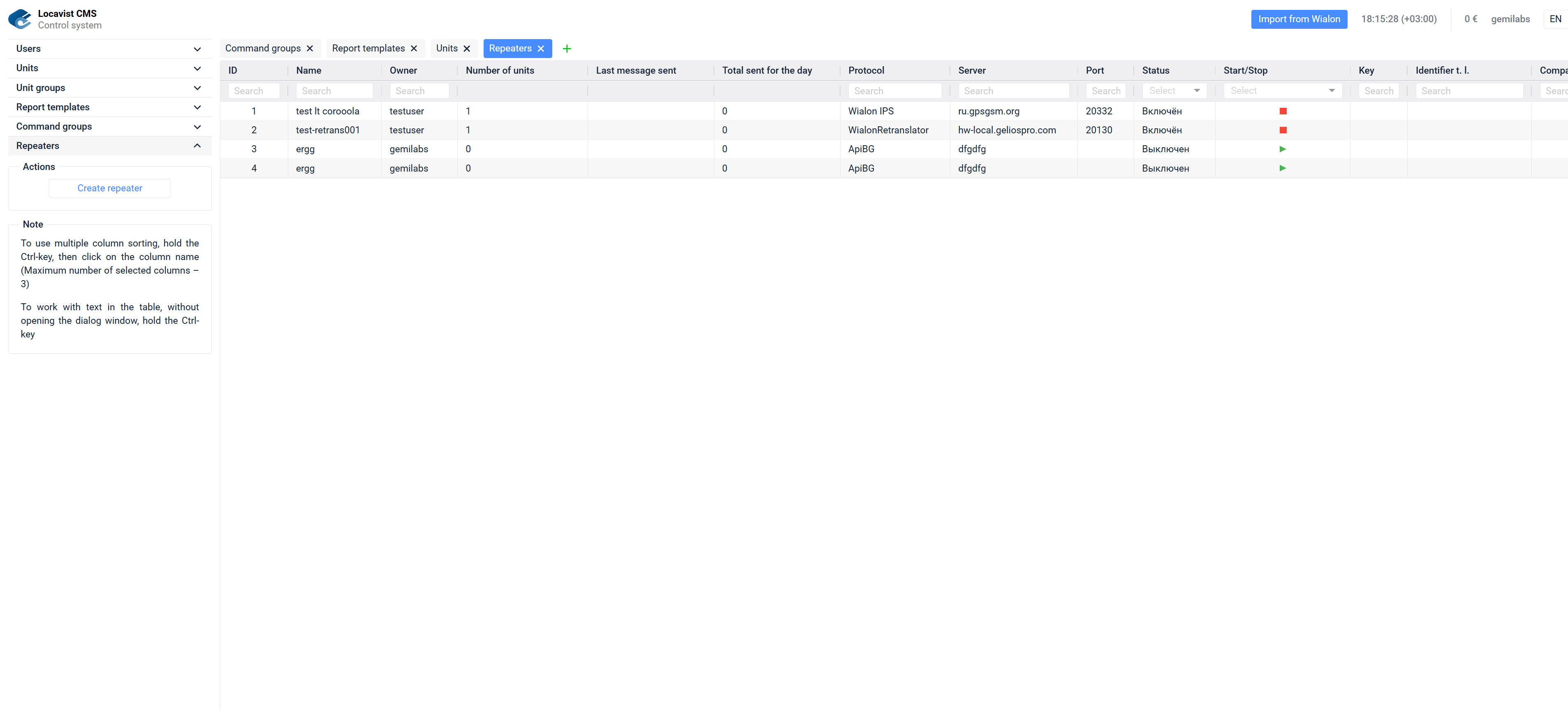 Раздел предназначен для настройки ретрансляции сообщений от объектов с сервера Gelios на другие сервера.