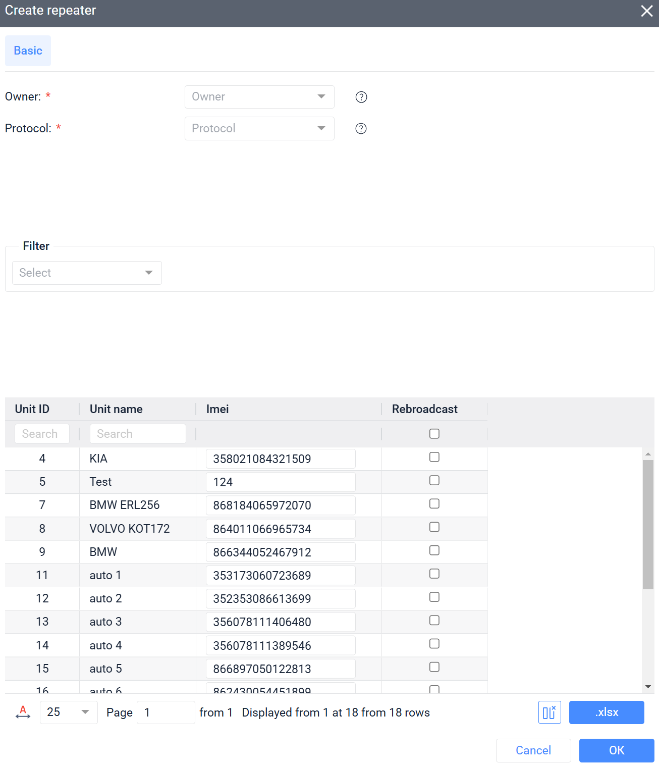 Ниже располагается Фильтр, в котором возможен выбор существующих групп объектов пользователей. Удобство заключено в отображении объектов конкретной группы или у конкретного пользователя. Пункт Только включенные показывает объекты, уже включенные в данный ретранслятор.